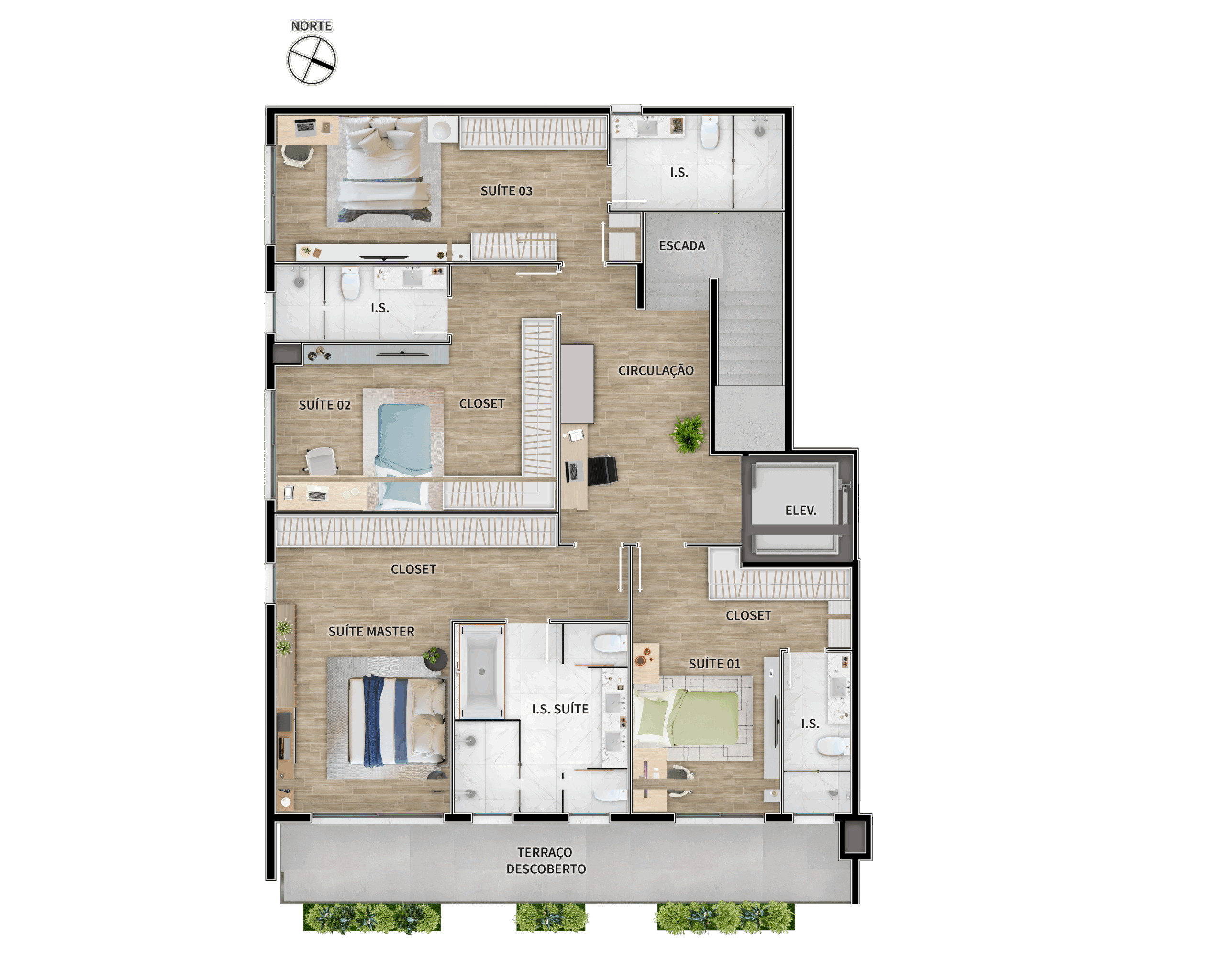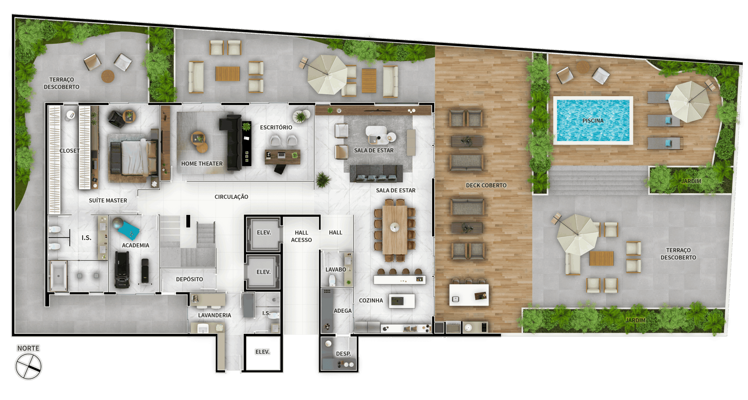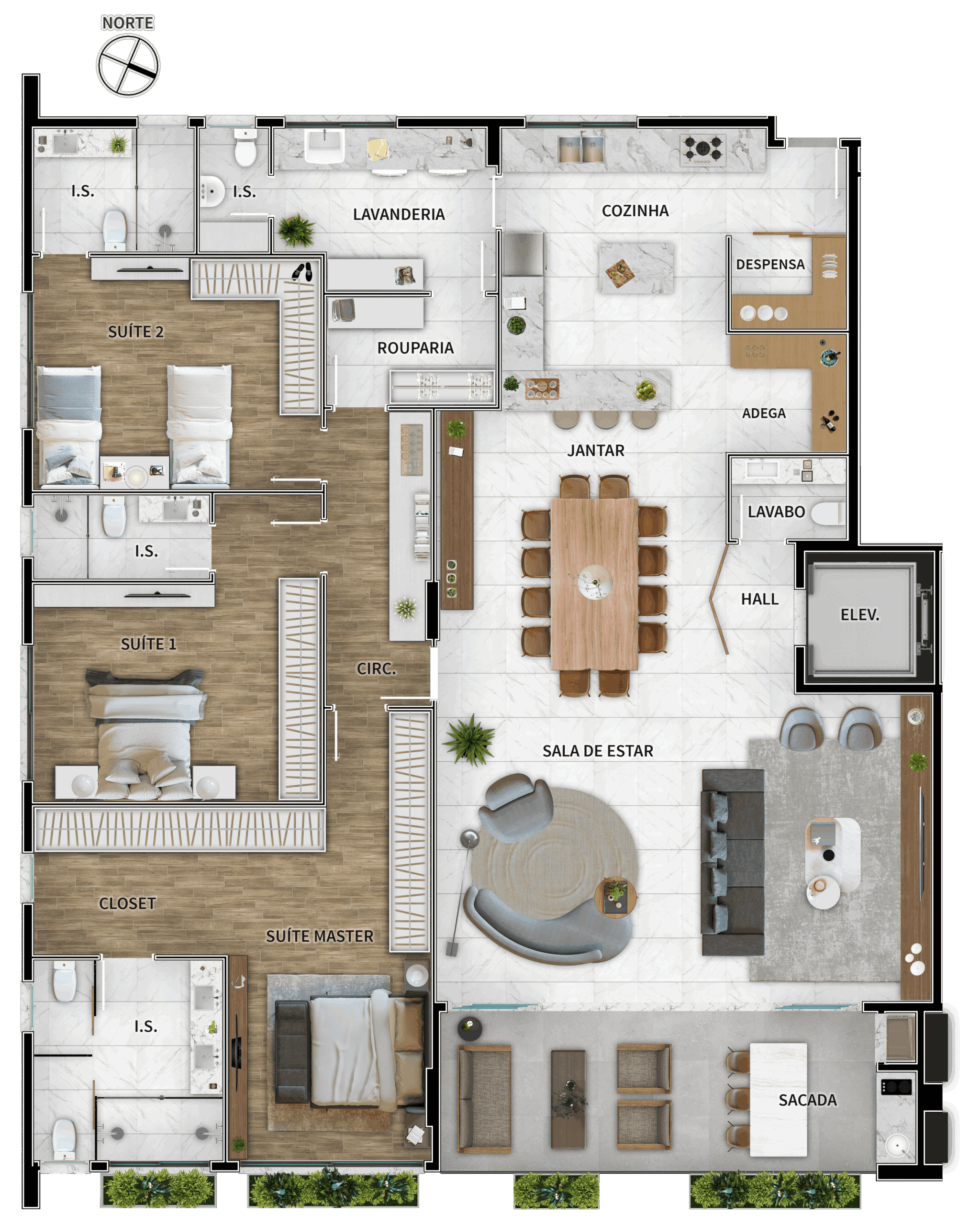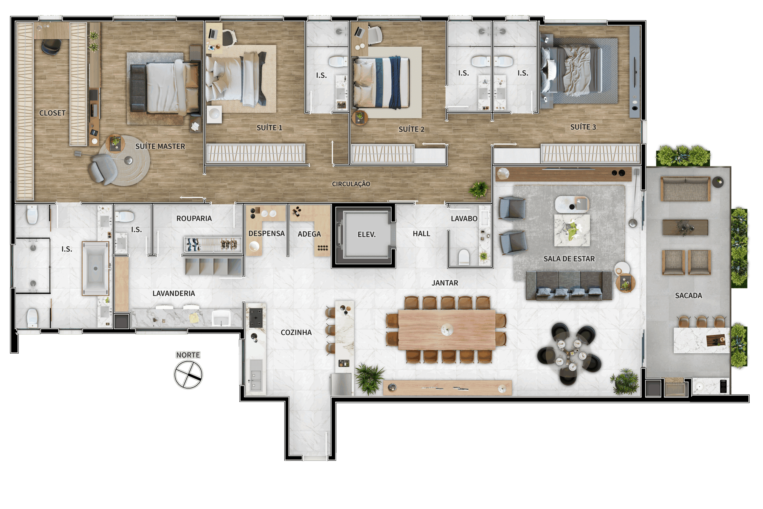 243 m² privativos com 3 suítes e 3 vagas de garagem
