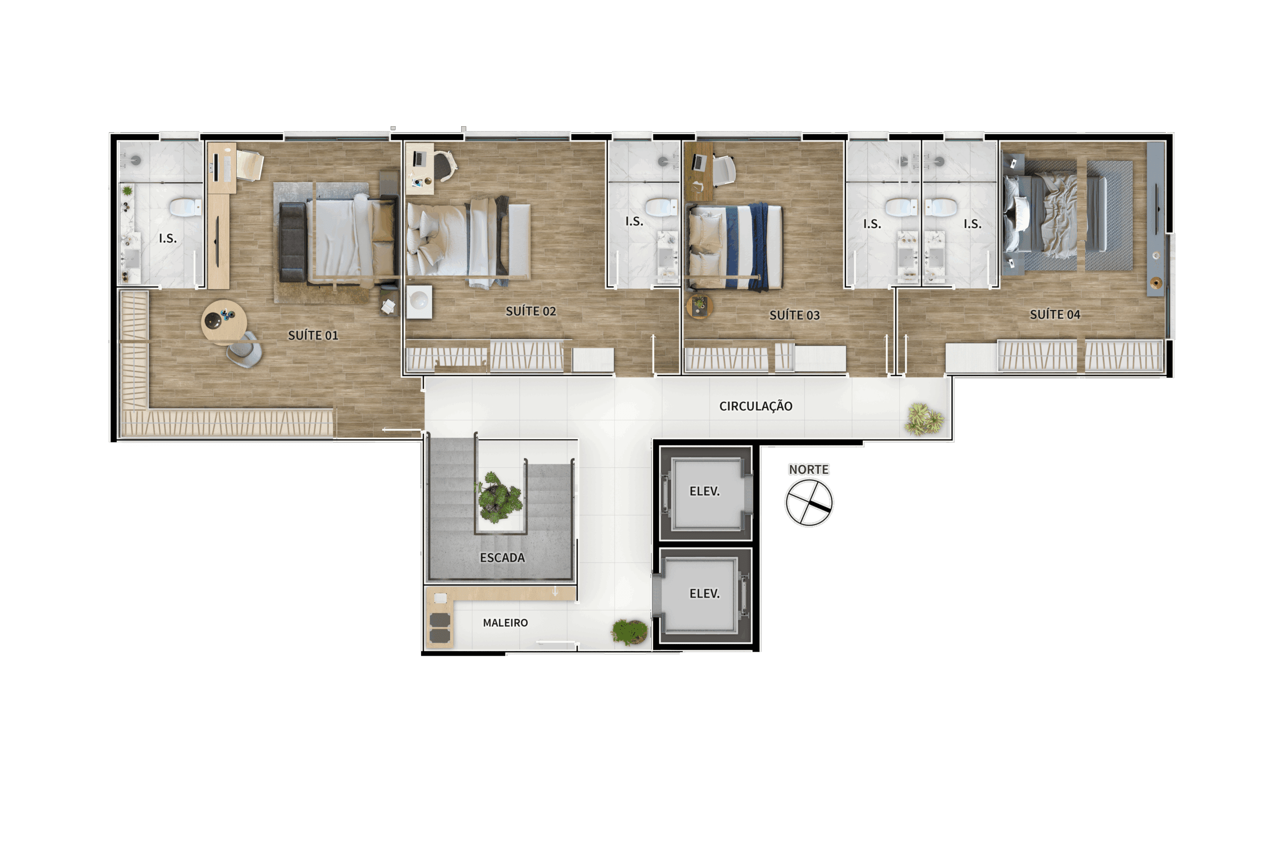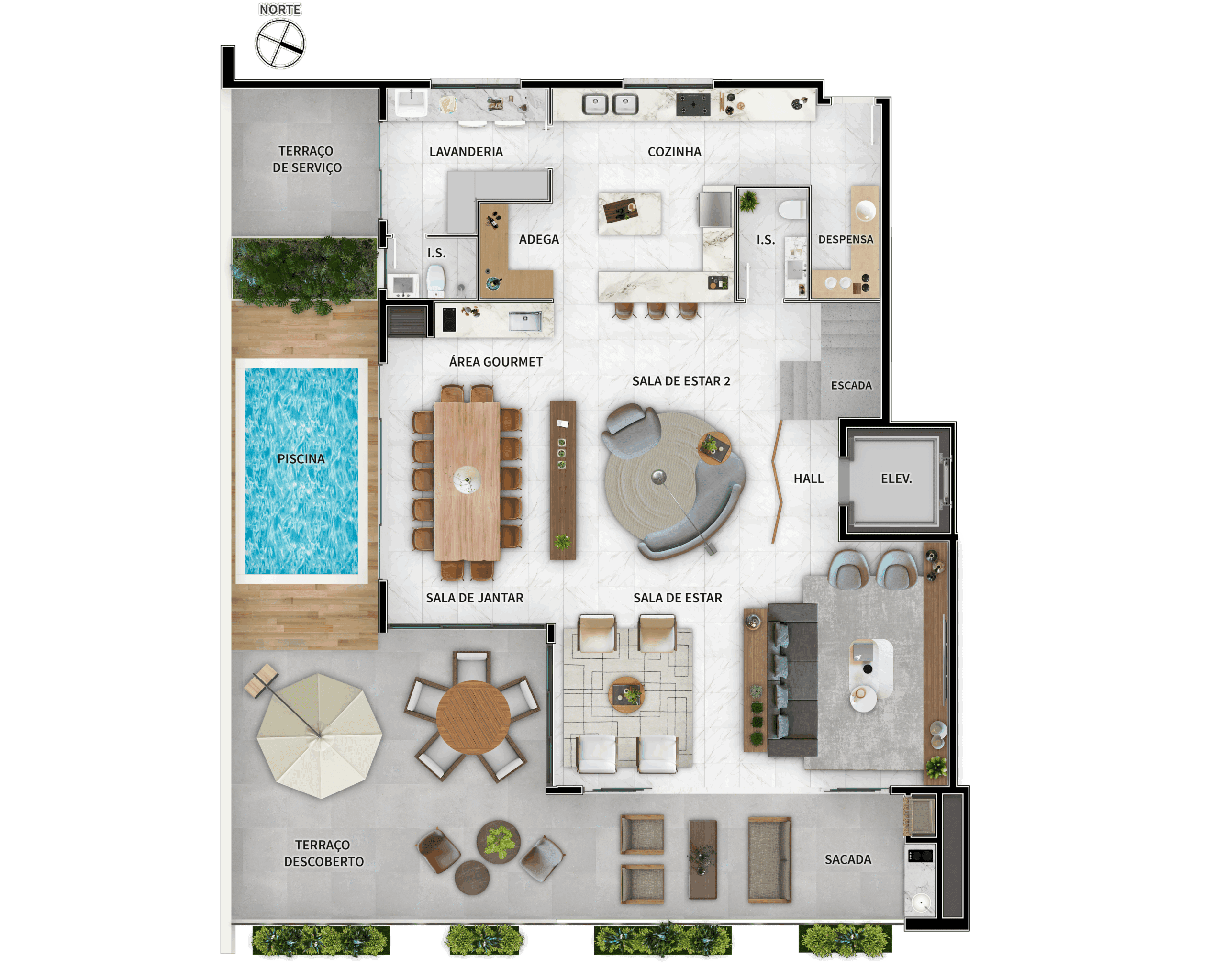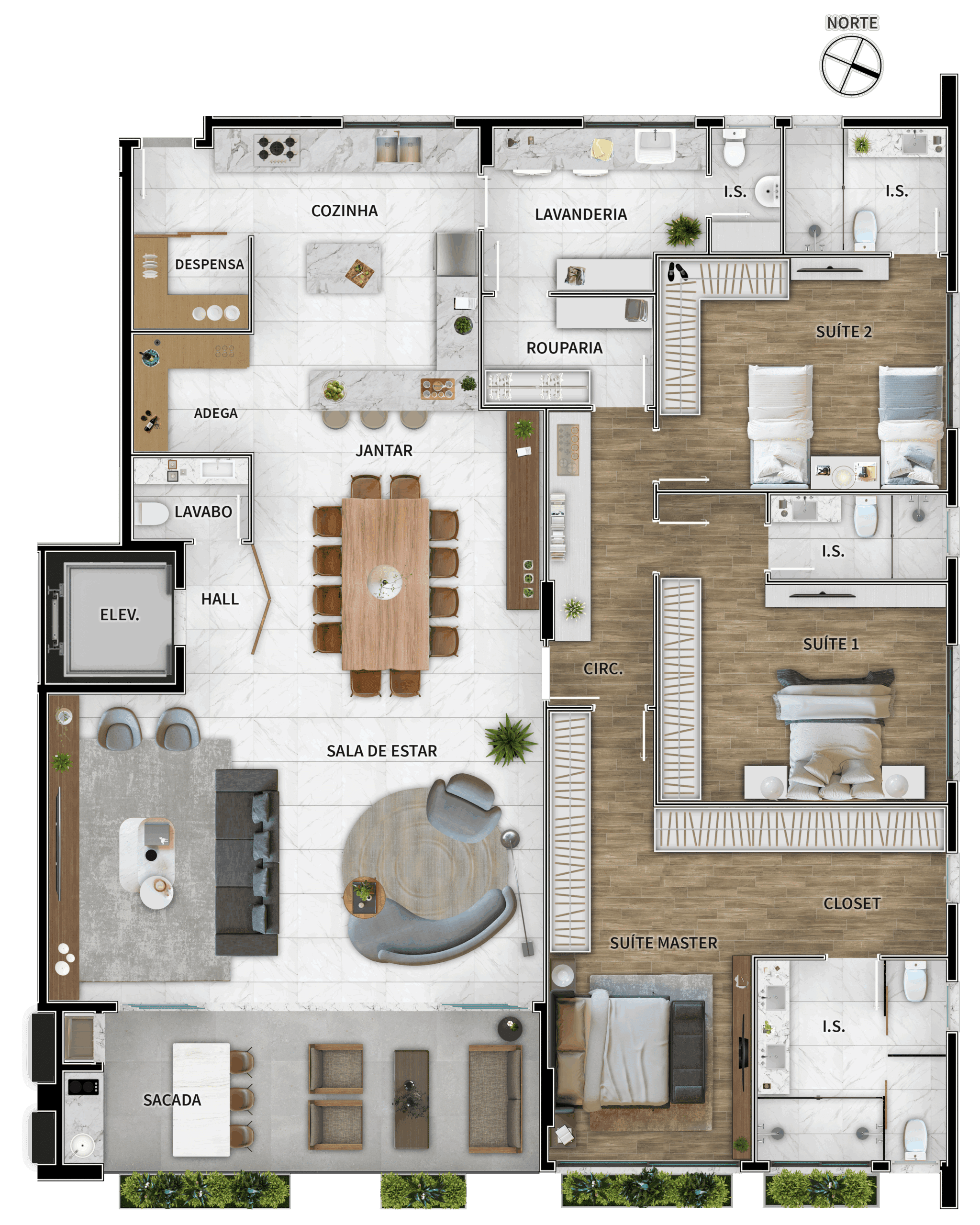 315,05 m² privativos com 4 suítes e 4 vagas de garagem